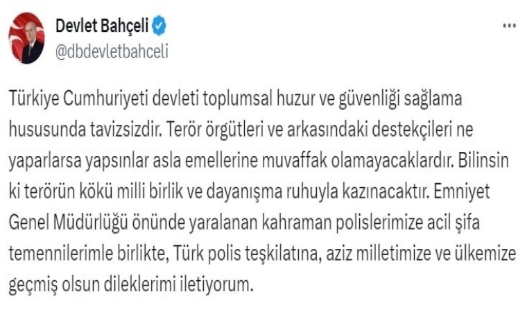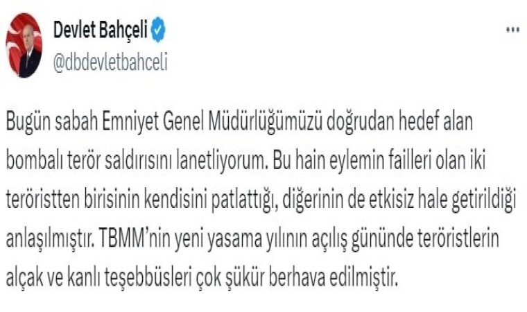 Sosyal medya hesabından açıklamalarda bulunan MHP Genel Başkanı Devlet Bahçeli, “Bugün sabah Emniyet Genel Müdürlüğümüzü doğrudan hedef alan bombalı terör saldırısını lanetliyorum. Bu hain eylemin failleri olan iki teröristten birisinin kendisini patlattığı, diğerinin de etkisiz hale getirildiği anlaşılmıştır. TBMM’nin yeni yasama yılının açılış gününde teröristlerin alçak ve kanlı teşebbüsleri çok şükür berhava edilmiştir. Türkiye Cumhuriyeti devleti toplumsal huzur ve güvenliği sağlama hususunda tavizsizdir. Terör örgütleri ve arkasındaki destekçileri ne yaparlarsa yapsınlar asla emellerine muvaffak olamayacaklardır. Bilinsin ki terörün kökü milli birlik ve dayanışma ruhuyla kazınacaktır. Emniyet Genel Müdürlüğü önünde yaralanan kahraman polislerimize acil şifa temennilerimle birlikte, Türk polis teşkilatına, aziz milletimize ve ülkemize geçmiş olsun dileklerimi iletiyorum” ifadelerini kullandı.