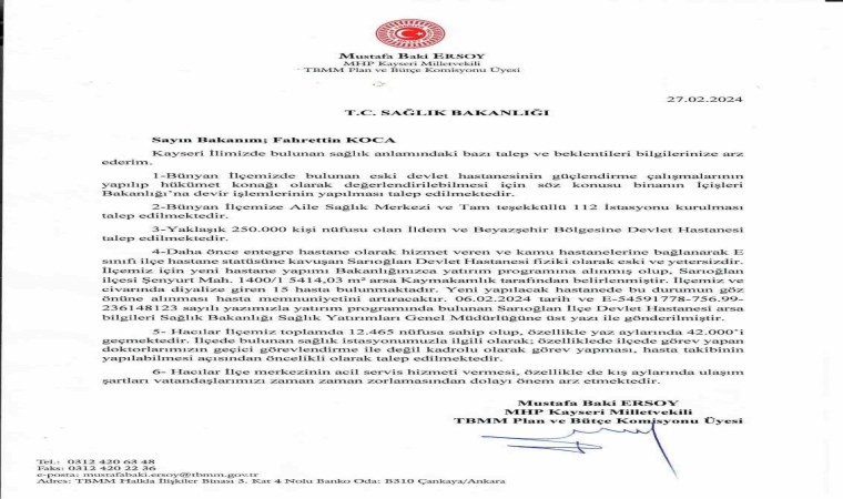 Milliyetçi Hareket Partisi (MHP) Kayseri Milletvekili Baki Ersoy; Sağlık Bakanı Fahrettin Koca’ya aralarında Bünyan, Sarıoğlan ve Hacılar’ın da bulunduğu talepleri içeren dosyayı verdi.