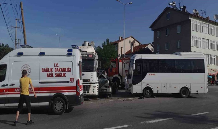 Bolu’da midibüsle çarpışan otomobil, midibüs ve kamyonun arasında kağıt gibi ezildi. Meydana gelen kazada otomobil sürücüsü yaralandı.