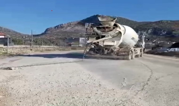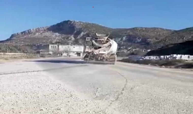 Hatay’da bir beton mikserinin yola beton döktüğü anlar kameraya yansırken, mikserlerin yola sıklıkla beton dökmesine mahalle muhtarı tepki gösterdi.