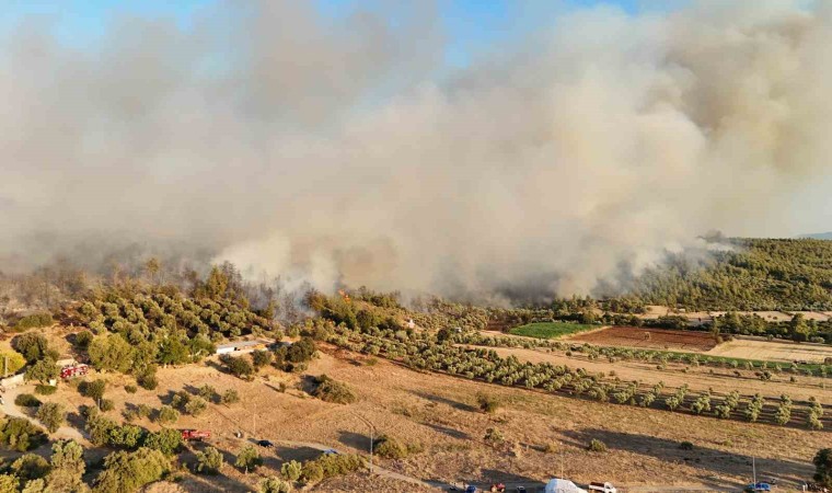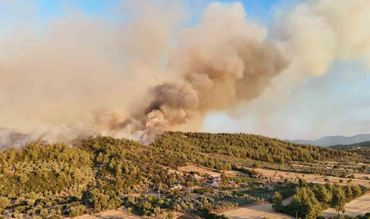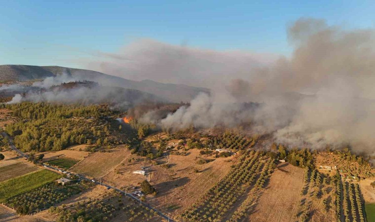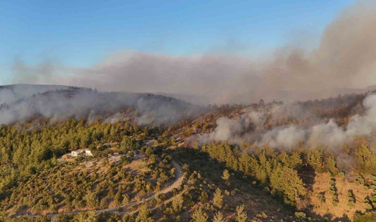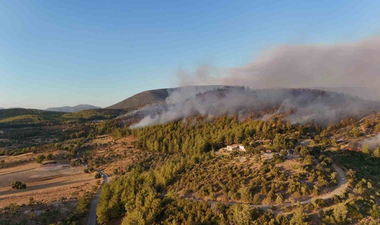Muğla’nın Milas ilçesinde çıkan ve rüzgarın şiddeti ile geniş bir alana yayılan orman yangını söndürme çalışmaları sürerken, yangın bölgesi havadan görüntülendi.