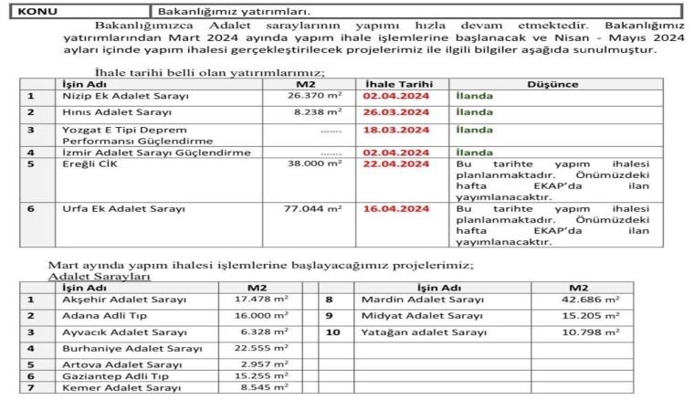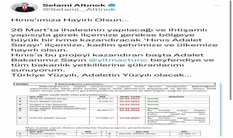 Altınok, sosyal medya hesabı üzerinden yaptığı paylaşımda, “26 Mart’ta ihalesinin yapılacağı ve ihtişamlı yapısıyla gerek ilçemize gerekse bölgeye büyük bir ivme kazandıracak ‘Hınıs Adalet Sarayı’ ilçemize, kadim şehrimize ve ülkemize hayırlı olsun. Hınıs’a bu projeyi kazandıran başta Adalet Bakanımız Sayın Yılmaz Tunç beyfendiye ve tüm bakanlık yetkililerine şükranlarımı sunuyorum. Türkiye Yüzyılı, Adaletin Yüzyılı olacak” ifadelerine yer verdi.