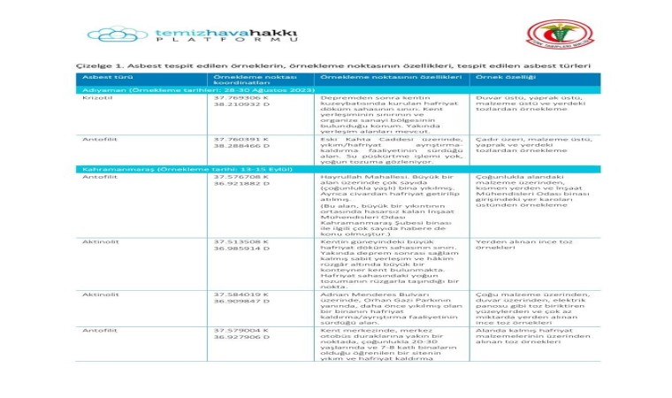 Milletvekili Tutdere, “Elektron mikroskobu ile yapılan asbest analizleri sonucunda Adıyaman kent merkezinde alınan 30 örneğin ikisinde, Kahramanmaraş kente merkezinde alınan 21 örneğin sekizinde, Elbistan kent merkezinde alınan 15 örneğin ikisinde farklı asbest türlerinin varlığı tespit edildiği belirtilmiştir. Buna karşın Sağlık Bakanlığı başta olmak üzere yetkili hiçbir kurumdan ses çıkmaması kurumların ve kurumların başındaki insanların konunun karşısındaki acziyetini ve sorumsuzluğunu gözler önüne sermektedir. Dünya Sağlık Örgütü Tarafından en önemli kanser nedenleri arasında sınıflandırılan amfibol asbest grubu minerallerinden ‘Antofilit’ türü asbest Adıyaman, Kahramanmaraş ve Elbistan’da tespit edilmiştir. Hem Adıyaman’da hem Kahramanmaraş’ta hafriyat sahalarının asbest tespit edilen sınırları yerleşim yerlerine ve konteyner kentlere yakınlığı ile dikkat çekmektedir. Bu çerçevede bölgede bina stokunun büyük oranda yıkılmış olması ile ortaya çıkan ciddi bir asbest riski söz konusudur. Defalarca gündeme getirdiğimiz ve önlem alınması için çağrılar yaptığımız bu konuda yetkililerden herhangi bir açıklama yapılmamış olması, talihsizliktir. Bilimsel olarak asbestin varlığı kanıtlanmış, vatandaşlarımız asbest soluyor ama hükümet yetkilileri bunu görmezden geliyor. Asbest riskine karşı alınabilecek önlemler halk sağlığını korumaya yönelik önlemlerdir. Bu bilinçle var olan mevzuatın ve standardın eksiksiz uygulanması şarttır. Bu nedenle öncelikle yapı yaşına bakılmaksızın, her bir bina enkazının asbest olup olmadığına dair incelemeye tabi tutulması, asbestli yapı bileşenlerinin varlığı tespit edilen bina ve enkazlar da ilgili yönetmelik ve Asbest İçeren Malzemelerin Sökümü ve Asbest Bertaraf Yöntemleri Kılavuzuna uygun olarak alınan önlemler çerçevesinde asbestli malzemeler güvenli biçimde uzaklaştırılması gerekmektedir. Bina yıkımı ve enkaz taşıma işlemlerine asbestli malzemelerin uzaklaştırılmasından sonra başlanmalıdır. Netice itibarıyla halk sağlığı için asbestle ilgili mevzuat doğrultusunda hareket edilmelidir” diye konuştu.