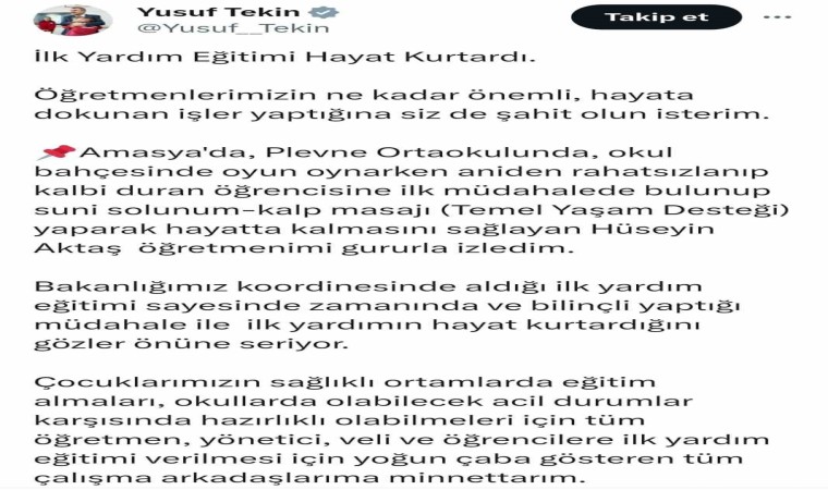 Plevne Ortaokulu’nda yaşanan olayda yaptığı kalp masajı ve suni teneffüsle 13 yaşındaki öğrencisi Çetin Çelebi’yi yaşama bağlayan Hüseyin Aktaş’ın hayat kurtardığı anların güvenlik kamerasına yansıyan görüntülerini sosyal medya hesabından aktaran Bakan Tekin, “Öğretmenlerimizin ne kadar önemli, hayata dokunan işler yaptığına siz de şahit olun isterim. Amasya’da, Plevne Ortaokulunda, okul bahçesinde oyun oynarken aniden rahatsızlanıp kalbi duran öğrencisine ilk müdahalede bulunup suni solunum-kalp masajı (Temel Yaşam Desteği) yaparak hayatta kalmasını sağlayan Hüseyin Aktaş öğretmenimi gururla izledim” notunu paylaştı.
