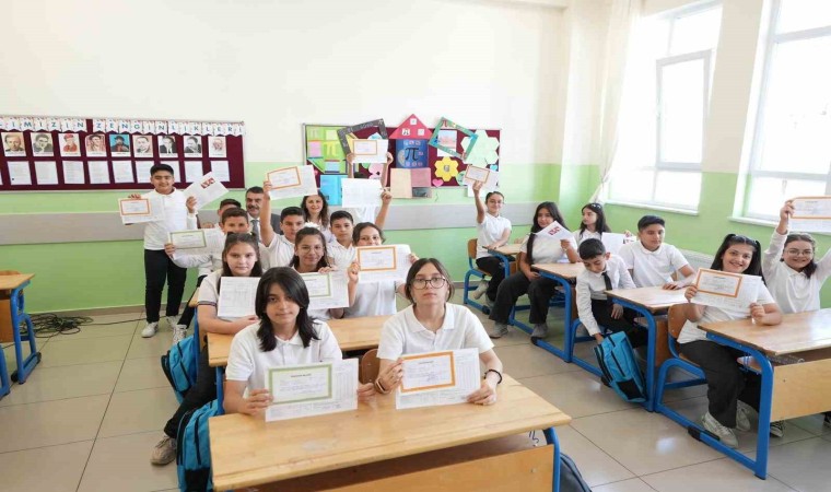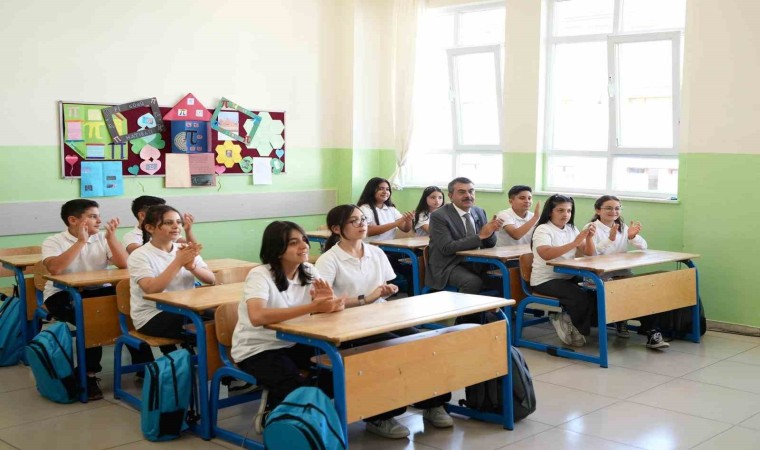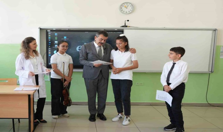 Sınıf öğretmeniyle öğrencilere karnelerini dağıtan Tekin, öğrencilerle de sohbet etti.
