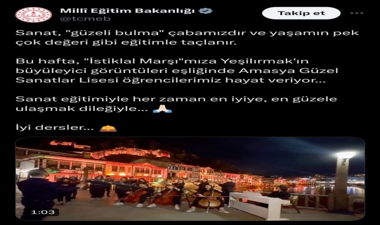 O görüntüler, “Sanat, "güzeli bulma" çabamızdır ve yaşamın pek çok değeri gibi eğitimle taçlanır. Bu hafta, İstiklal Marşı’mıza Yeşilırmak’ın büyüleyici görüntüleri eşliğinde Amasya Güzel Sanatlar Lisesi öğrencilerimiz hayat veriyor. Sanat eğitimiyle her zaman en iyiye, en güzele ulaşmak dileğiyle. İyi dersler” notuyla paylaştı.