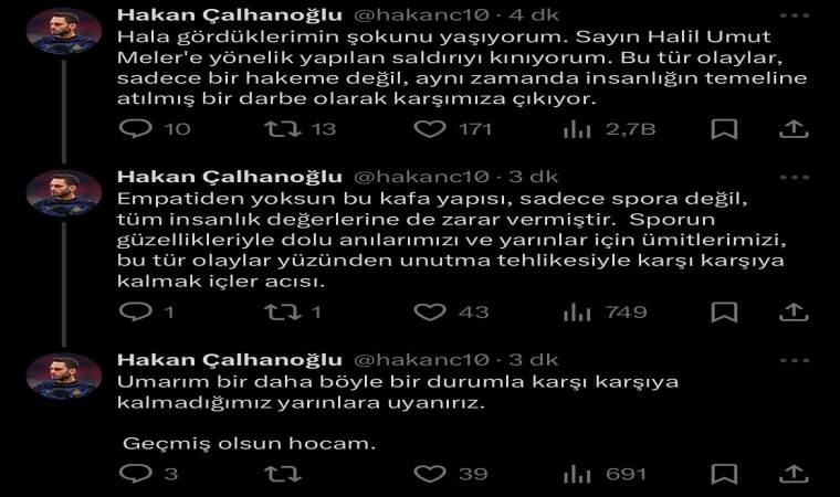“Şiddetle kınıyoruz. Hakem Halil Umut Meler’e yapılan saldırıyı kınıyorum. Ailesine ve kendisine geçmiş olsun dileklerimi iletiyorum.”