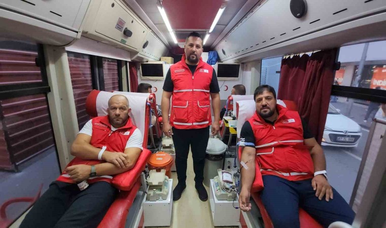 Türk Kızılay Zonguldak Şubesi tarafından düzenlenen söyleşide gençlerle biraraya gelen milli güreşçiler, mobil kan bağış aracında kan bağışladı.