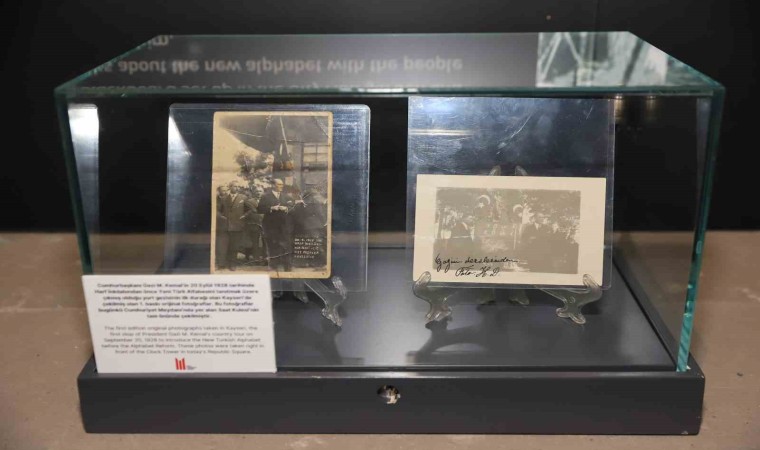 Latin Alfabesine geçiş döneminde Kayseri’ye gelen Gazi Mustafa Kemal Atatürk’e ait yeni fotoğraflarında müze de sergilendiğine işaret eden Gündüz, “Gazi Mustafa Kemal, 21 Aralık 1919 Heyeti Temsiliye olarak geldiği tarihten itibaren 4 defa daha Kayseri’ye geldiğini biliyoruz. 20 Eylül 1928 yılında İsmet İnönü ile birlikte Kayseri’ye geldiklerinde Saat Kulesi önünde bir kara tahta kurduruluyor. Kara tahta üzerine yeni Latin Alfabesi ile ilk denemeler gerçekleşiyor. Bu denemelerin en önemli şahitleri günümüze gelen fotoğraflardır. Seyahatim yazılı bir görsel internette çok fazla rastlayacağımız bir görsel ama biz müzeye iki fotoğraf daha kazandırdık. Sergilenen bu görseller o güne ait görsellerdir. Müze severler buraya geldiklerinde Mustafa Kemal Atatürk’ün o günlere ait fotoğraflarını görebilirler” ifadelerini kullandı.