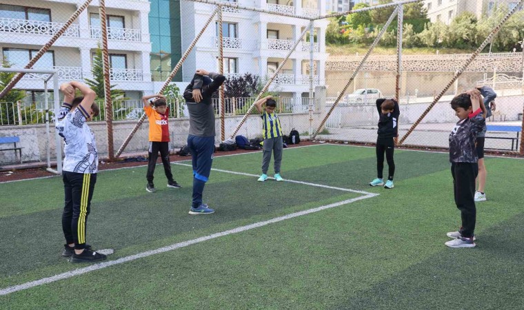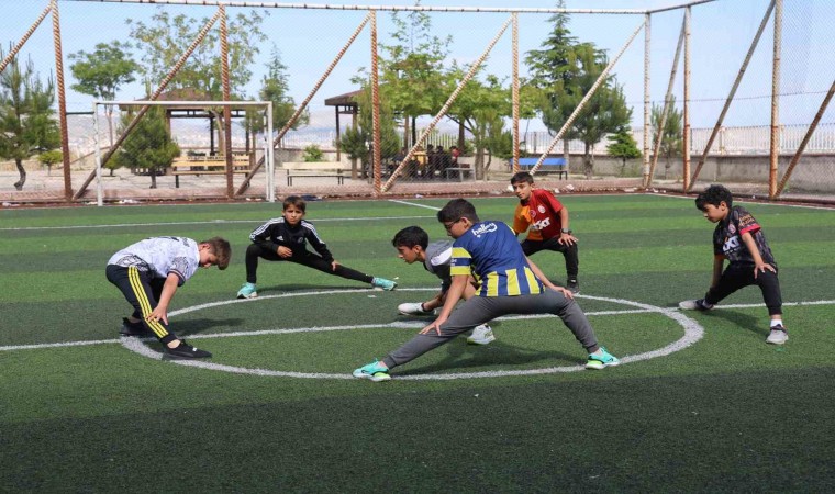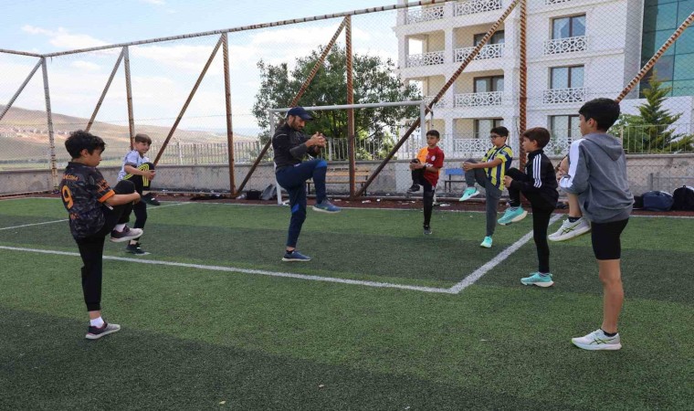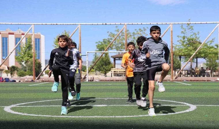 Elazığ’da, atletizmde Balkan şampiyonu olan Hasan Turgut öncülüğünde bir araya gelen küçük atletler, mahalle okulunun tahsis ettiği çim sahada Avrupa şampiyonasına hazırlanıyor.