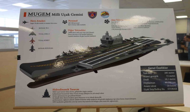 Uçak gemisinin yakıt ikmalsiz İstanbul’dan New York’a kadar gidip geleceğini ifade eden Doç. Dr. Mühendis Albay Hakan Uçar, “Yapılan tasarım çalışmaları sonucunda gemimiz yaklaşık 60 bin ton deplasmana, 72 metre genişliğe ve 285 metre tam boya sahip olacaktır. Uçuş güvertemiz 3 koşu yollu çift kalkış pisti ve 1 iniş pistinden oluşacak, hava araçlarımız için kısa mesafeden kalkış ve halatlı yakalama sistem, STOBAR’a sahip olacaktır. Yakıt ikmali yapmadan 10 bin deniz mili yani İstanbul’dan New York’a kadar gidip gelebilecek ve 4 adet gaz türbininden oluşan ana tahrik sistemi ile 25 knots azami sürate sahip olacaktır. Yerli ve milli hava araçlarımızdan BAYKAR üretimi Kızılelma ve TB-3 ile TUSAŞ üretimi Hürjet ve ANKA-3 hava araçlarımız gemiden kalkış ve iniş yapabileceklerdir. Bununla birlikte gemide kullanılacak tüm sistemler için öncelikle yerli savunma sanayi firmalarımız ile birlikte çalışacağız” diye konuştu.