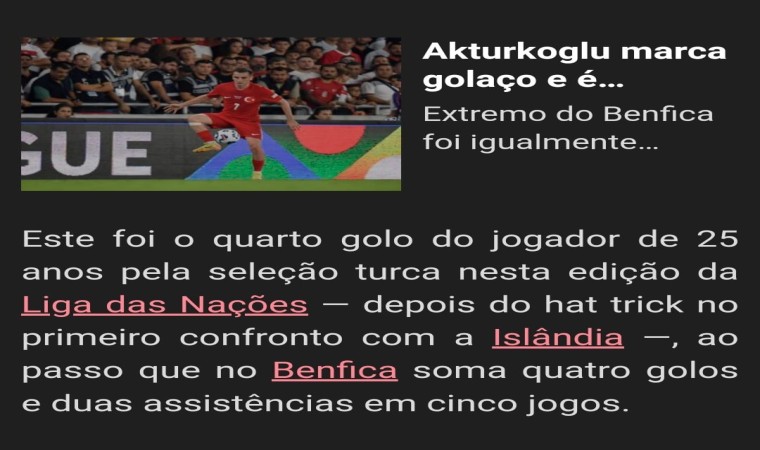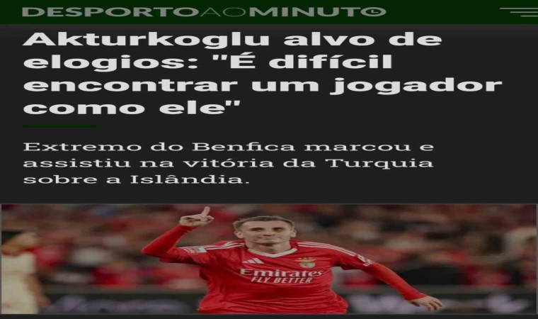 Desporto Ao Minuto da Kerem Aktürkoğlu’nun gol sevincinden yola çıkarak, sihrini sadece Benfica’da değil, milli takımda da yapmaya devam ettiğini yazdı. Aktürkoğlu’nun, Türkiye’nin deplasmanda İzlanda’yı 4-2 mağlup ettiği maçta parladığını ve yaptığı asistin yanı sıra harika bir gol de attığını vurguladı.
