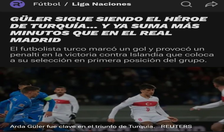 İspanyol AS gazetesi, Arda Güler’in 88. dakikada attığı golle galibiyetin geldiğinden bahsederek, Güler’in önderliğinde Türklerin muhteşem bir performansla geri dönüşe imza attığından söz etti.