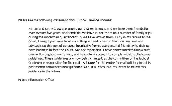 ABD merkezli internet haber kanalı ProPublica’nın 6 Nisan tarihli makalesinde, Teksaslı emlak milyarderi ve Cumhuriyetçi Parti’nin en büyük bağışçısı Harlan Crow’un masraflarını karşıladığı lüks seyahatlere çıkmakla suçlanan ABD Yüce Mahkeme Yargıcı Clarence Thomas, bugün savunma açıklaması yaptı. Yargıç Thomas açıklamasında şu ifadelere yer verdi;