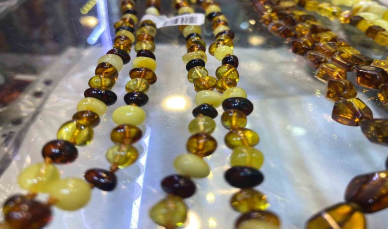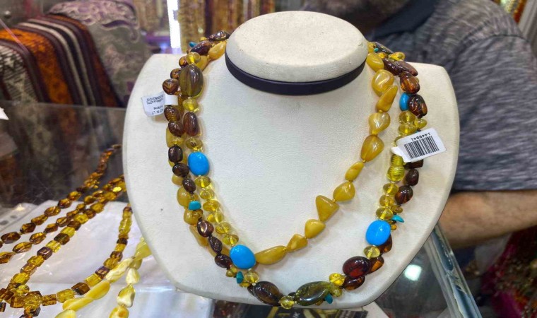 Şifalı olarak bilinen doğal taşlardan olan ve yaklaşık 1 milyon yıllık damla kehribardan yapılan kolyeler 2 bin liradan alıcı buluyor.