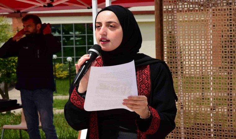 Anma etkinliğinin açılışında konuşan İktisadi ve İdari Bilimler Fakültesi Uluslararası İlişkiler Bölümü öğrencileri Saja Eshtaya ve Farah Ali Hassan, İsrail’in Filistin’de gerçekleştirdiği ihlal ve katliamların, 14 Mayıs 1948’de Filistin topraklarında işgal devletinin kuruluşunu ilan etmesiyle daha da şiddetlendiğini belirtti. Nekbe’nin, 500’den fazla köyün İsrail tarafından yerle bir edilmesi ve 800 bin Filistinlinin kitlesel göçüyle sonuçlanan bir olay olarak tarihlerde yer aldığını vurgulayan öğrenciler, yapılan işgali kınadı.