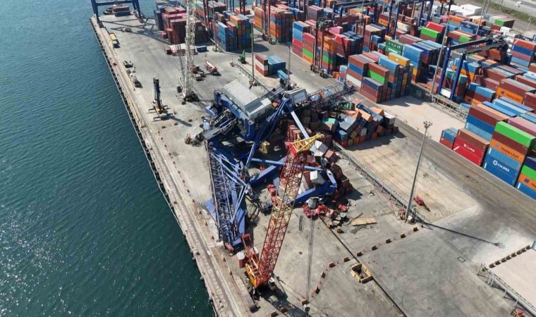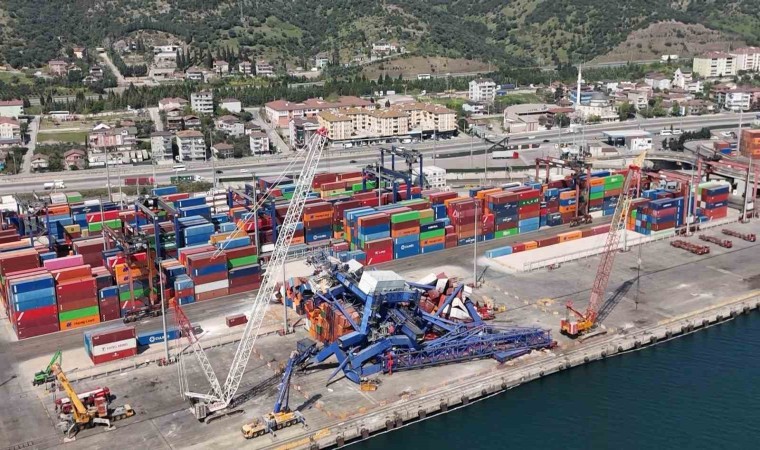 Kocaeli’de Evyapport liman işletmesinde 368 metre uzunluğunda ve 51 metre genişliğindeki konteyner yüklü geminin kıyıdaki 3 kule vince çarparak devirdiği kazanın ardından 1 aydır enkaz kaldırma çalışmaları sürüyor. Kule vincin parçaları ve parçaların altında kalan konteynerler dron ile görüntülendi. Öte yandan, 60 milyon dolarlık hasara sebep olduğu tahmin edilen kaza, çevre limanlarda ve D-100 kara yolunun İzmit ve Derince ilçesi geçişlerinde yoğunluk oluşturuyor.