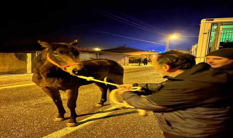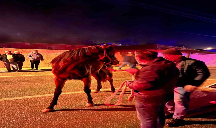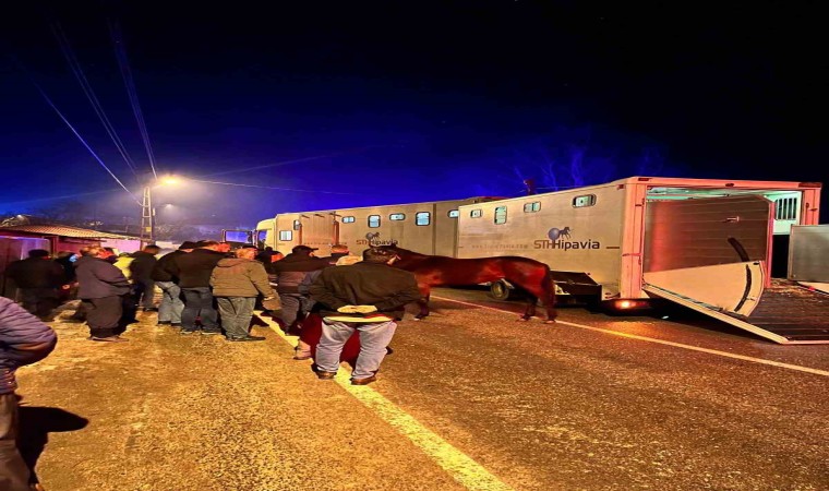 Edirne’nin Havsa ilçesinde yarış atlarının bulunduğu tır, çekici ile çarpıştı. Milyonluk yarış atlarının tır dorsesinden çıkarılmasına yardım eden köy sakinleri, atları sakinleştirmeye çalıştı.