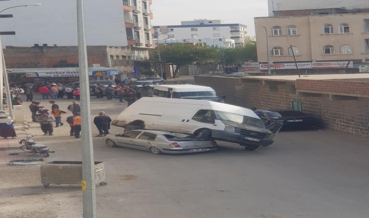 Şanlıurfa’nın Siverek ilçesinde kontrolden çıkan minibüs, park halindeki bir araca çarptıktan sonra, başka bir aracın üstüne çıkarak durabildi.