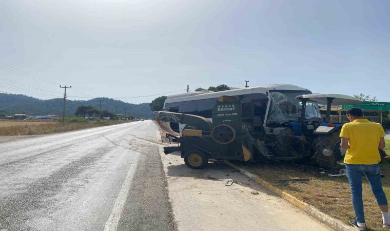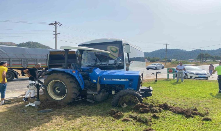 Kaza, Marmaris-Datça karayolu Değirmenyanı mevkiinde meydana geldi. Edinilen bilgiye göre, karayolundan akaryakıt istasyonuna dönüş yaptığı sırada 48 YB 513 plakalı traktöre, aynı istikamette ilerleyen 48 S 1613 plakalı minibüs çarptı. Çarpmanın etkisi ile minibüsün önünde sürüklediği traktör refüje çıktı. Kaza ihbarı üzerine bölgeye sağlık ve jandarma ekipleri sevk edildi. Kazada hafif şekilde yaralanan traktör sürücüsü hastaneye kaldırıldı.