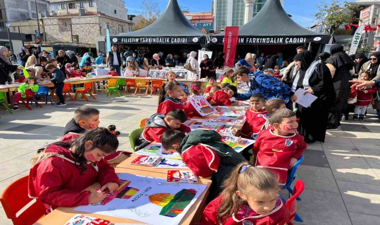 Filistin’de yaşanan savaş tüm şiddetiyle sürerken, dünyanın dört bir yanında olduğu gibi Ümraniye’de de Filistin’e destek için düzenlenen protestolar ve etkinlikler devam ediyor. Ümraniye Belediyesi ev sahipliğinde düzenlenen ve ilçe müftülüğüne bağlı 4-6 yaş grubu Kur’an kurslarında eğitim gören öğrenciler, ellerine aldıkları fırça ile boyama yaparak, Filistin’de ölen akranları için farkındalık oluşturdu. Öte yandan 15 Temmuz Şehitler Meydanı’nda kurulan Filistin Farkındalık Çadırındaki bağış sandığına destek olmak isteyen vatandaşlar uzun kuyruklar oluşturdu.