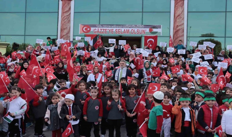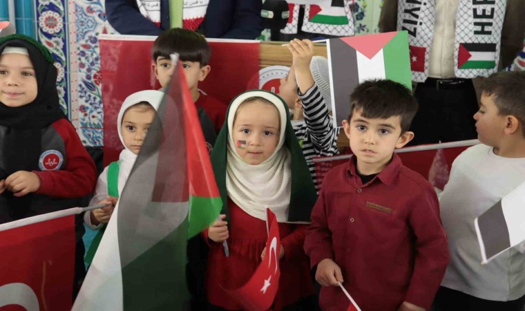 Konuşların ardından çocuklar ellerini semaya açarak, Filistin için dua ederken, ‘Gazze bizim, Kudüs bizim, katil İsrail’ diye slogan attılar.
