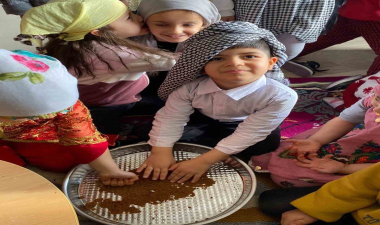 Batman Artuklu İlkokulu anasınıfı A ve B şubesi minikleri Tutum ve Yerli Malı Haftasını sınıfta çiğköfte yoğurup, saç ekmeği yaparak kutladı.