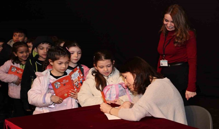 Öğrencilerin sorularını da yanıtlayan Burcu Ünsal, minikler için kitaplarını da imzaladı.