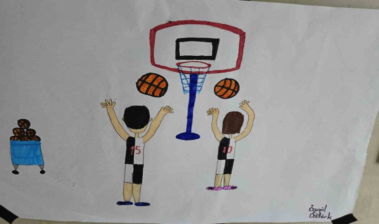 Kayseri’de minik basketbol sporcuları çizdikleri resimler ile spor salonunda sergi açtı. Sporcular, ardından aynı salonda antrenman yaptı.