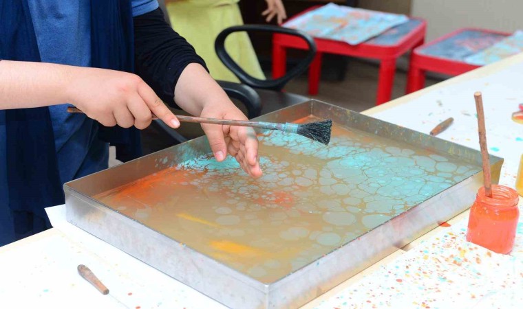 Çocukların yaz tatilini dolu dolu ve daha eğlenceli bir şekilde değerlendirmesi için birbirinden renkli etkinlikler düzenleyen Kahramanmaraş Büyükşehir Belediyesi, ebru sanatı atölyesini miniklerle buluşturdu.
