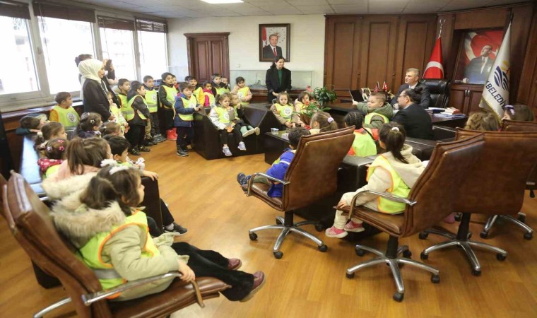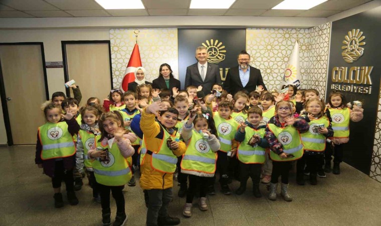 Düzağaç Anaokulu öğrencileri ziyaret ettikleri Gölcük Belediye Başkanı Ali Yıldırım Sezer’e kendi çizdikleri renkli kalpleri hediye etti.