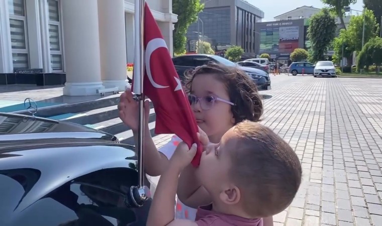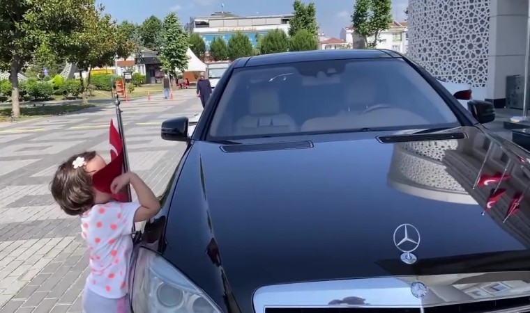 Düzce Valiliği’ne ait araçta bulunan Türk bayrağına valilik bahçesinden geçmekte olan iki miniğin sevgisi yürekleri ısıttı.