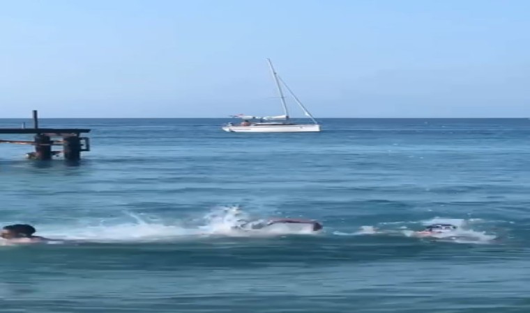 Sosyal medyada paylaşılan ve Kemer ilçesinde olduğu belirtilen görüntülerde, denize giren vatandaşlar kıyıda yüzgeci su yüzeyinde olan bir balık gördü. Köpekbalığı paniğine kapılan bazı vatandaşlar sudan çıkarken, bazıları da sahilden aldıkları taşla balığı kovmaya çalıştı.