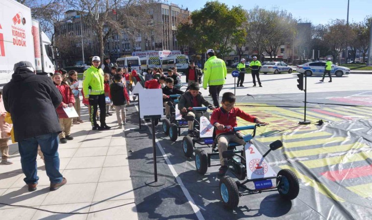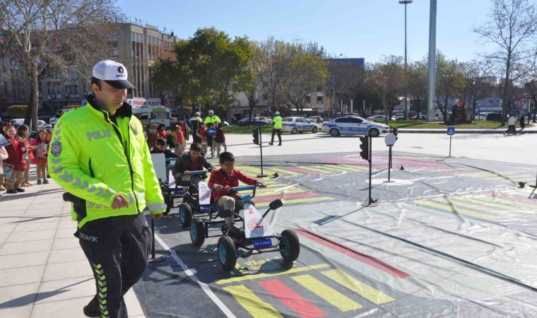 Öğrencilere ayrıca eğitici kitap, kırmızı düdük ve trafik kartları dağıtıldı.