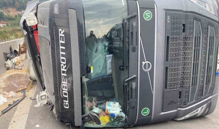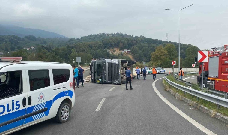 Kaza, Düzce’nin Kaynaşlı ilçesi Anadolu Otoyolu bağlantı yolu üst geçidinde meydana geldi. Alınan bilgiye göre Düzce D100 Karayolu Kaynaşlı ilçesi mevkiinden Anadolu Otoyoluna girmek isteyen O.A. idaresindeki 14 EA 182 plakalı moloz atıkları taşıyan tır, sürücüsünün direksiyon hakimiyetini kaybetmesi sonrasında yat yattı. 112 Acil Çağrı Merkezi’ne yapılan ihbar üzerine olay yerine sağlık, itfaiye ve trafik ekipleri sevk edildi. Sağlık ekipleri sürücü O.A.’ya olay yerinde yaptığı müdahalenin ardından hastaneye kaldırdı.