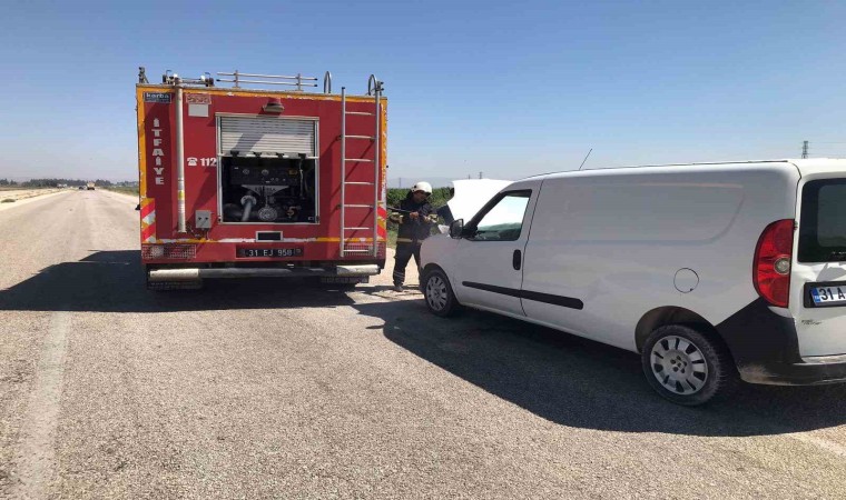 Hatay’da seyir halindeyken motor kısmı yanmaya başlayan araçta maddi hasar oluştu.