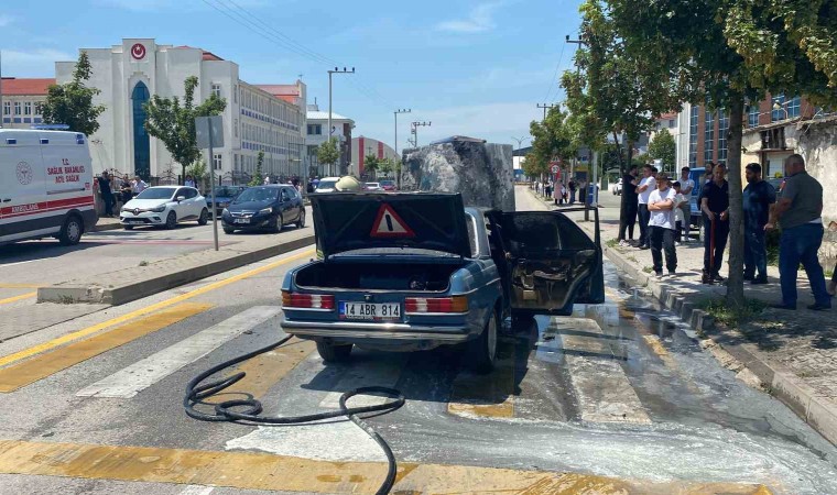 Olay, Aktaş Mahallesi Şehit Güven Keskin Sokak’ta meydana geldi. Edinilen bilgiye göre, Nuri Ö. yönetimindeki 14 ABR 814 plakalı Mercedes marka otomobil, motor kısmından alev aldı. Aracın yandığını fark eden sürücü Nuri Ö., otomobilini yol kenarına park etti. Araçtan inmeye çalışan Nuri Ö. elinden yaralanırken yangın 112 Acil Çağrı Merkezi’ne bildirildi. Kısa sürede büyüyen alevler, aracın büyük bir bölümünü sardı. İhbar üzerine bölgeye itfaiye ve sağlık ekipleri sevk edildi. Olay yerine gelen itfaiye ekiplerince alevler aracın bagajında bulunan yakıt tüpüne gelmeden yangın söndürüldü. Ekiplerin araçta soğutma çalışması yaptığı esnada, elinden yaralanan Nuri Ö.’nün ayakta tedavisi yapıldı.