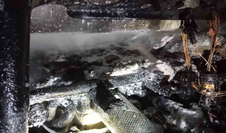İtfaiye ekiplerinin güçlükle söndürdüğü yangında tır tamamen yanarak kullanılamaz hale geldi.