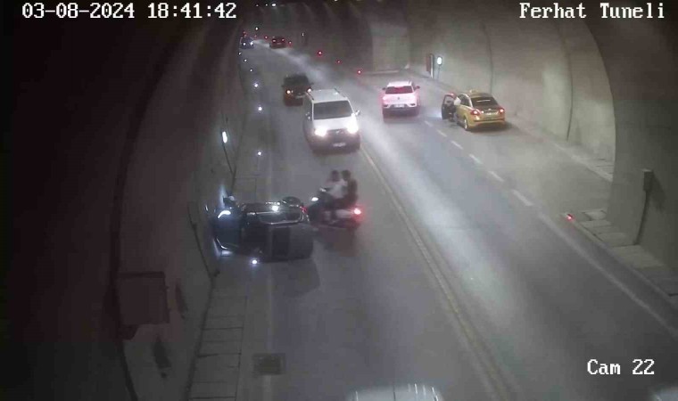 Amasya’da tünelde seyir halindeyken kontrolden çıkan motorlu bisiklet duvara çarparak devrildi. 2 kişinin yaralandığı kaza anı güvenlik kamerasına yansıdı.