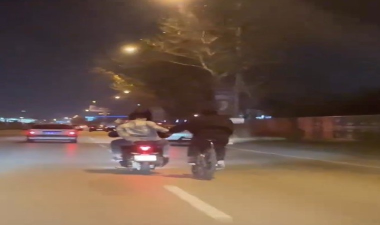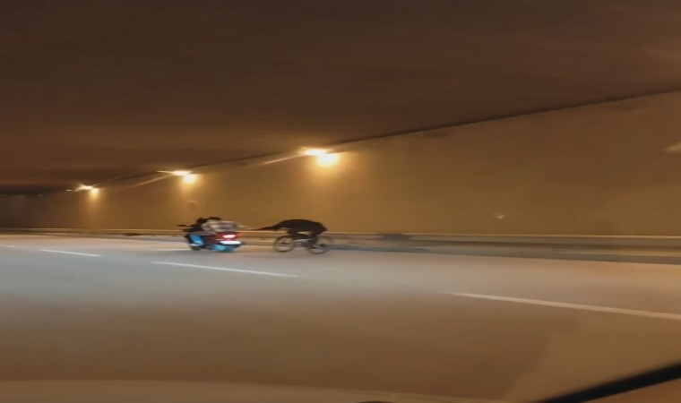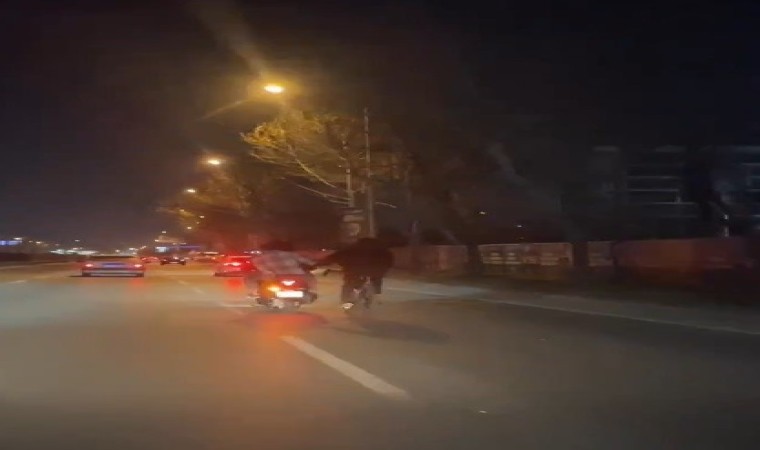Bursa’da akan trafikte motosikletteki arkadaşına tutunarak ilerleyen bisiklet sürücüsü tehlikeye davetiye çıkardı.