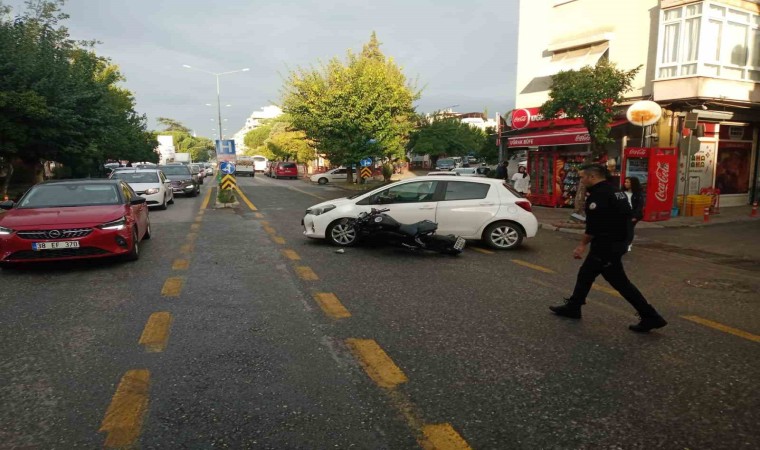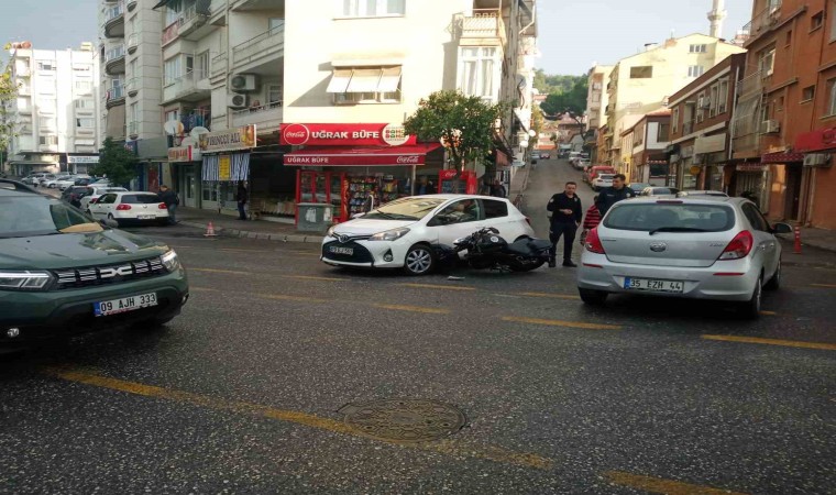 Aydın’ın Efeler ilçesinde motosiklet ile otomobilin çarpışması sonucu meydana gelen kazada, motosiklet otomobilin ön tarafına saplandı.