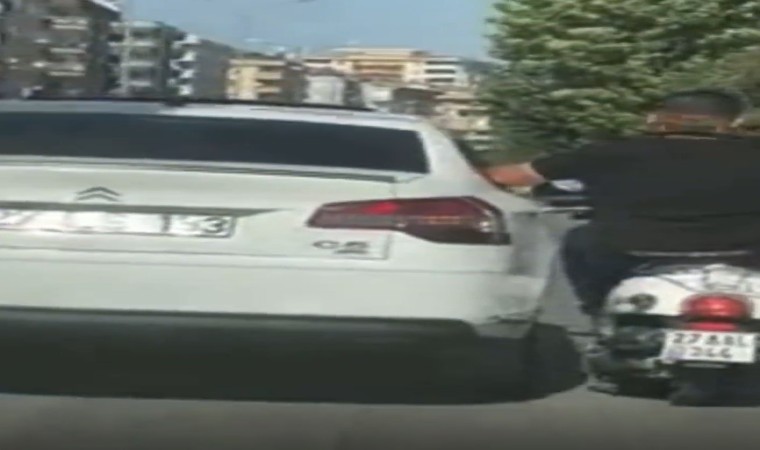 Gaziantep’te bir motosiklet sürücüsü, trafikte seyir halindeki bir başka aracın camına tutunarak metrelerce ilerledi. Motosikletlinin tehlikeli yolculuğu ise başka sürücü tarafından cep telefonu kamerası ile görüntülendi.