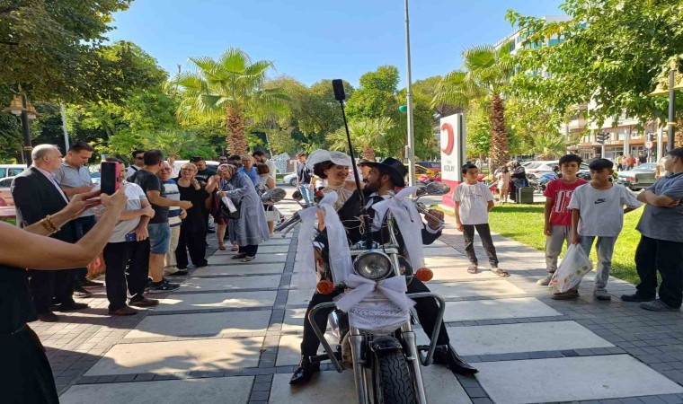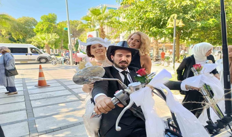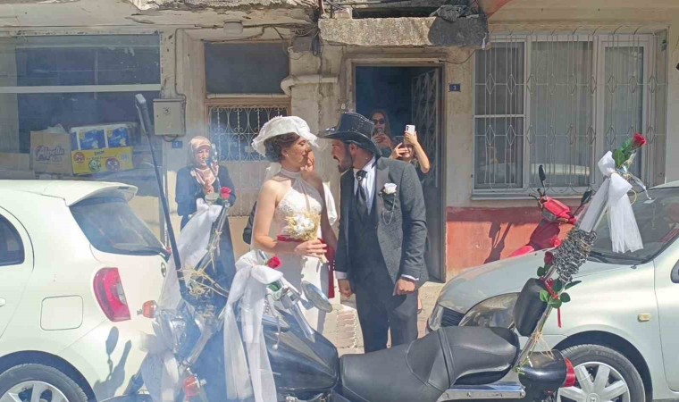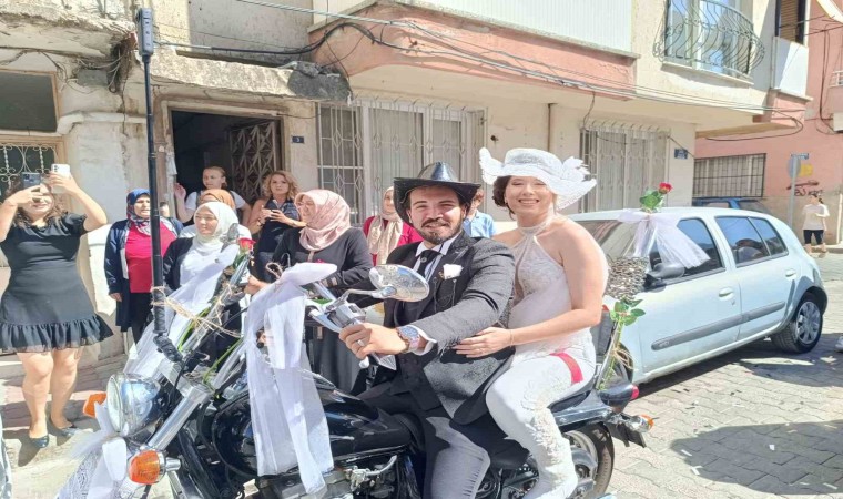 Manisa’nın Turgutlu ilçesinde, motosiklet tutkunu çiftin gelin arabası motosikletleri oldu. Renkli görüntülerin ortaya çıktığı gelin alma töreninde, araç konvoyu da motosiklet grubundan oluştu.