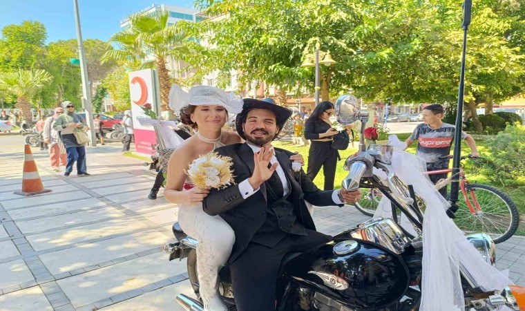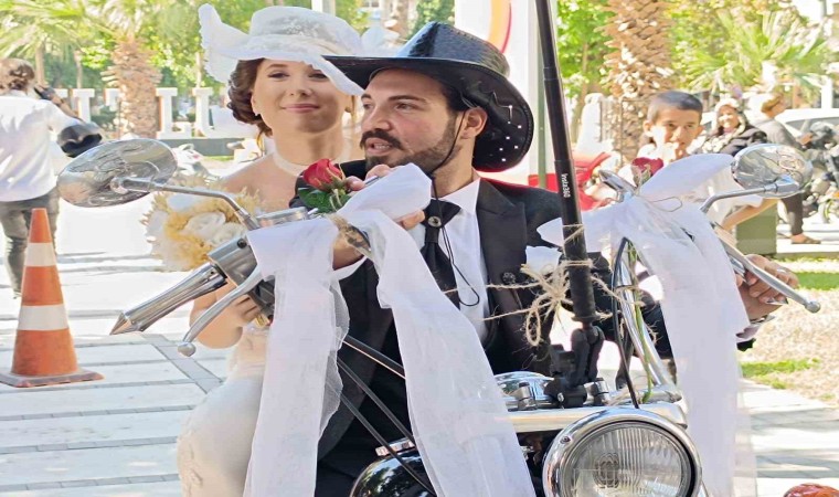 Turgutlu Cumhuriyet Mahallesi’nde bulunan gelin Petek Arasan’ın evinden çıkış anında duygusal anlar yaşanırken, damadın motosiklete bindirdiği gelin ile birlikte motosikletli düğün konvoyu nikah salonunun yolunu tuttu. İlçede motosikletleri ile tur atarak büyük ilgi çeken Petek ve İlhan çifti nikah salonunda davetliler tarafından alkışlarla karşılandı. Renkli görüntülere sahne olan organizasyon, çiftin nikahlarının kıyılmasının ardından son buldu.