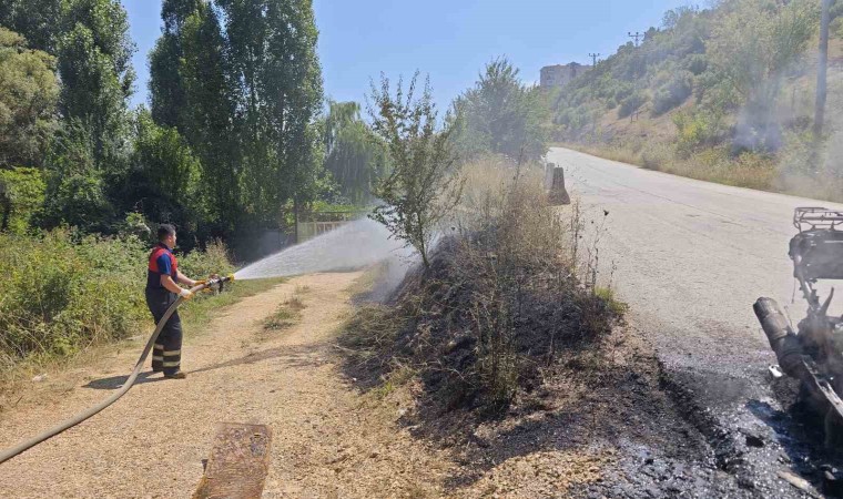 Bilecik’te seyir halinde yanmaya başlayan motosikletten çıkan alevlerin sıçraması sonucu otluk alana başlayan yangın, itfaiye ekiplerinin anında müdahalesiyle söndürüldü.