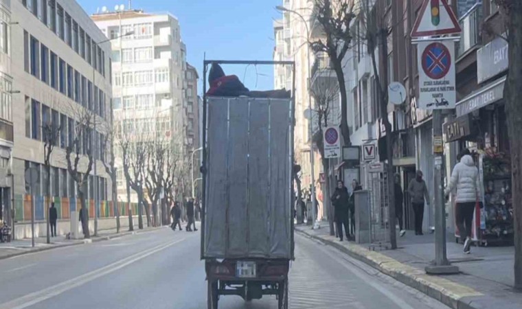 Eskişehirde hiçbir önlem almadan üç tekerlekli motosikletin kasasındaki yüklü kartonların üzerine çıkıp yolculuk yapan şahıs trafiği tehlikeye attı.