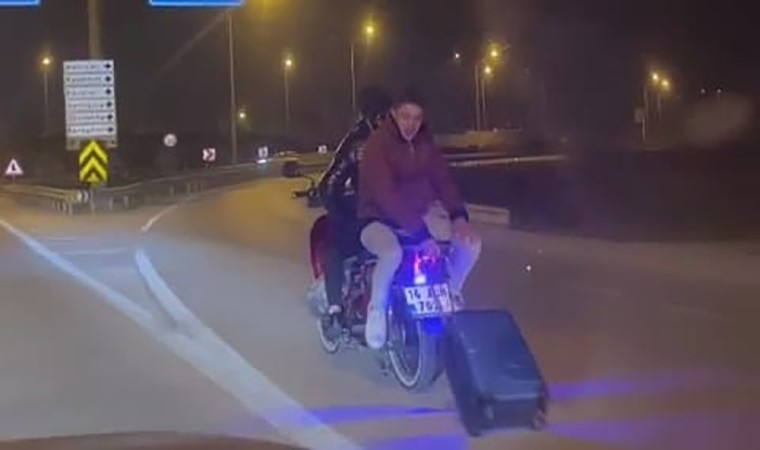 Olay, Bursa-Ankara karayolu İnegöl girişinde meydana geldi. Sürücü yönetimindeki motosikletin arkasına ters oturan genç, elindeki tekerlekli bavulu yol üzerinde sürükleyerek seyretti. Gençlerin tehlikeli yolculuğu ise başka bir sürücünün amatör kamerasına saniye saniye yansıdı.