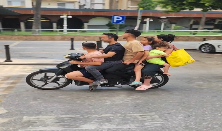 Merkez Seyhan ilçesinde şehrin en işlek yollarından olan Atatürk Caddesi’nde motosiklet ile yolculuk yapan aile görenlerin dikkatini çekti. İki kişilik motosiklete aynı aileden 2’si çocuk 6 kişinin binmesi hayrete düşürdü. Motosiklete binenlerin kasksız olması ve kadının kucağındaki çocuğun en ufak bir sarsıntıda düşme ihtimali tehlikeyi artırırken, diğer aile üyelerinin de balık istifi yolculuk yaptığı görüldü. Ölümüne yolculuk vatandaşların bakışları arasında devam ederken, o anlar vatandaşlar tarafından görüntülendi.