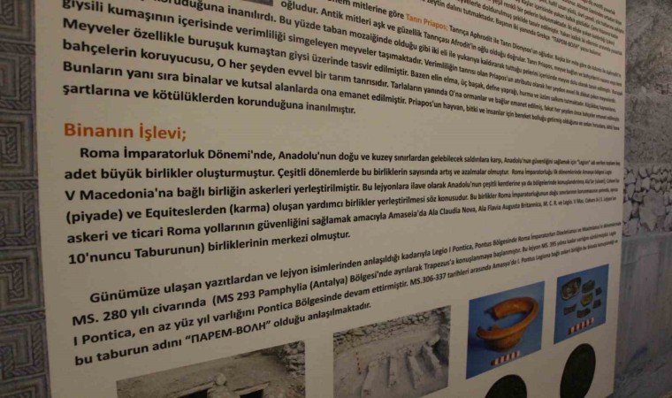 Amasya’da 11 yıl önce kazılarda bulunup geçen yıldan itibaren sergilenmeye başlanan bin 700 yıllık mozaiğin gizemi çözüldü. Yapılan araştırmada mozaiğin ortasındaki tanrı figürlü madalyonda Grekçe yazılı ‘?APEM’ ve ‘BO?H’ ifadelerinin Roma askeri birliğini simgelediği ortaya çıktı.