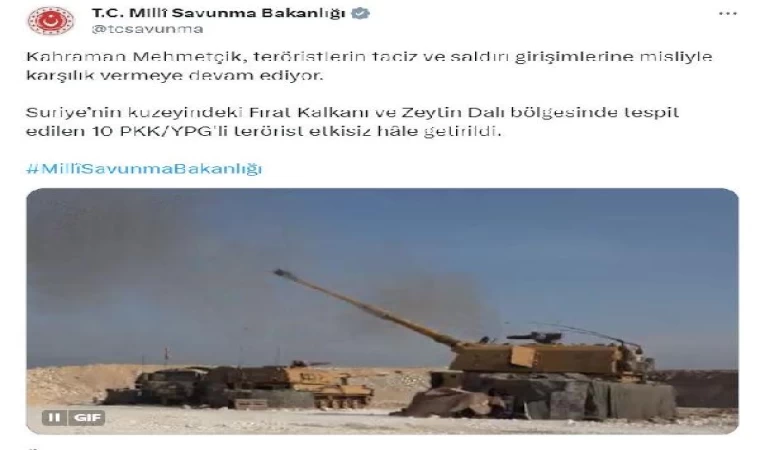 Bakanlığın sosyal medya hesabından yapılan açıklamada, "Kahraman Mehmetçik, teröristlerin taciz ve saldırı girişimlerine misliyle karşılık vermeye devam ediyor. Suriye’nin kuzeyindeki Fırat Kalkanı ve Zeytin Dalı bölgesinde tespit edilen 10 PKK/YPG'li terörist etkisiz hale getirildi" denildi. (DHA)